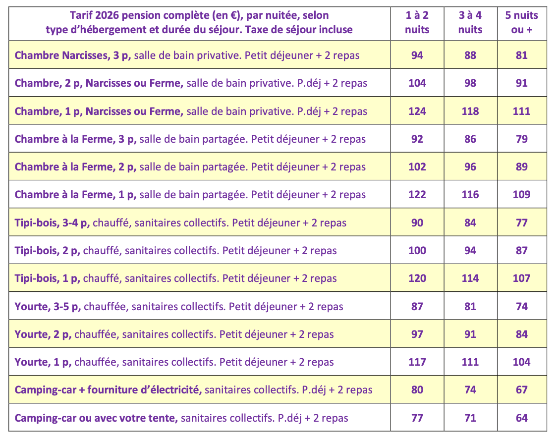 En fonction des disponibilités, ton choix te sera attribué avec en priorité celui le plus cher. Il faut multiplier le nombre de nuits par 2 et compter 26 € en plus de l'hébergement pour le dernier repas de midi de dimanche.