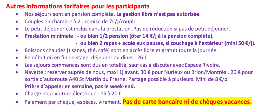 Le paiement pour l'Espace Rivoire se fait sur place le jour mĂŞme du stage.